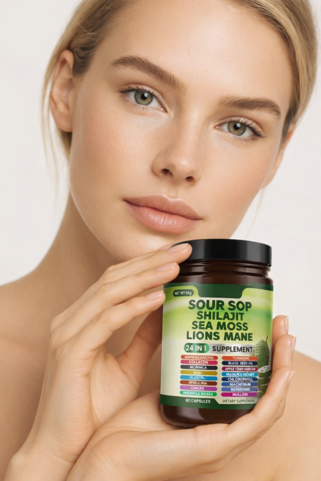 This powerful 24-in-1 wellness formula combines some of nature’s most valued ingredients into one daily supplement. Featuring Soursop, Shilajit, Sea Moss, and Lion’s Mane, this blend is designed to support energy, focus, immunity, and overall vitality.